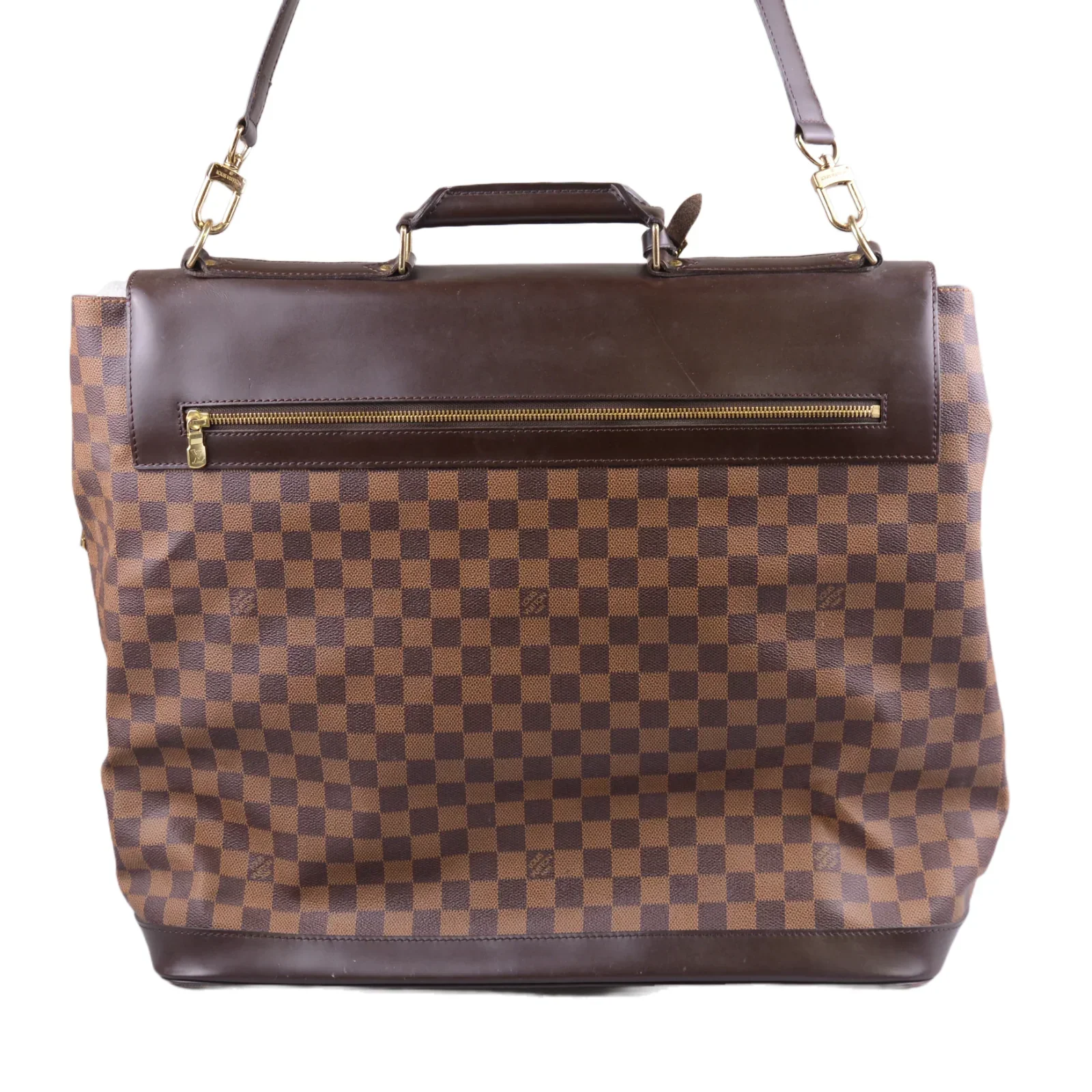 This second-hand Louis Vuitton travel bag is crafted from signature Damier canvas and finished with a detachable and adjustable flat leather strap, a leather top handle and high-shine gold-tone hardware and buckles. The top flap opens to a deep red fabric interior, and on the back is a large zipper pocket.